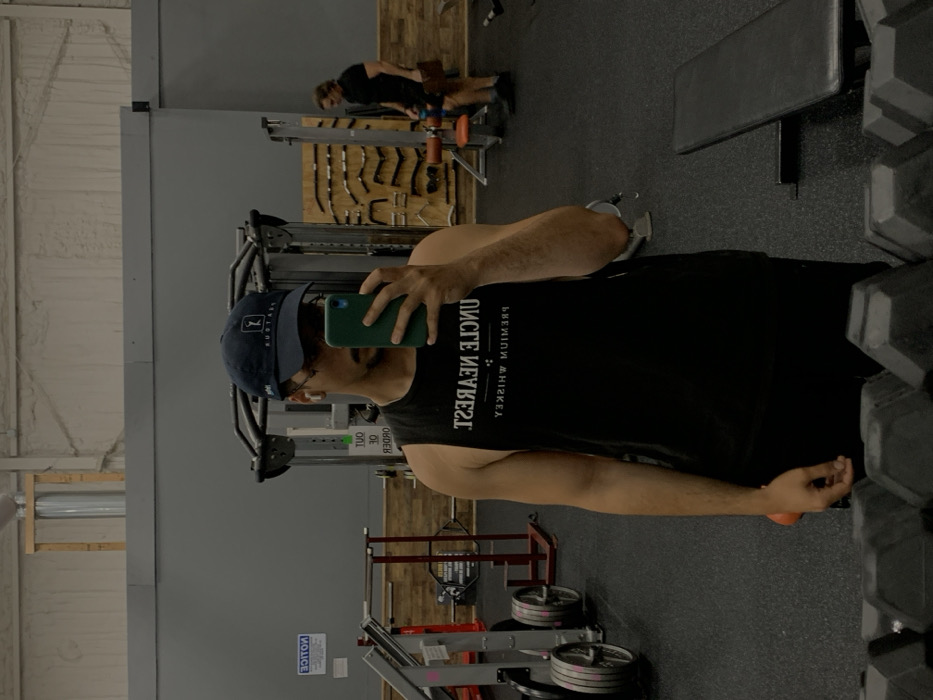 A man in a gym setting takes a selfie, wearing a navy blue baseball cap and a black tank top