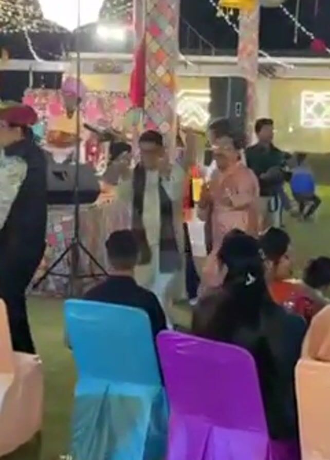 The scene takes place at an outdoor event, likely a party or wedding, at night. Festoon lights and decorations, including colorful umbrellas, are strung above. On a stage, a band plays for a crowd. Several men are dancing on the lawn in front of chairs occupied by seated guests. One man in a cream-colored kurta and maroon and gray scarf dances while smiling towards another man in a pink floral kurta and white pants, who dances facing the stage. The lawn is green. The chairs are covered in teal, purple, and peach-colored satin.