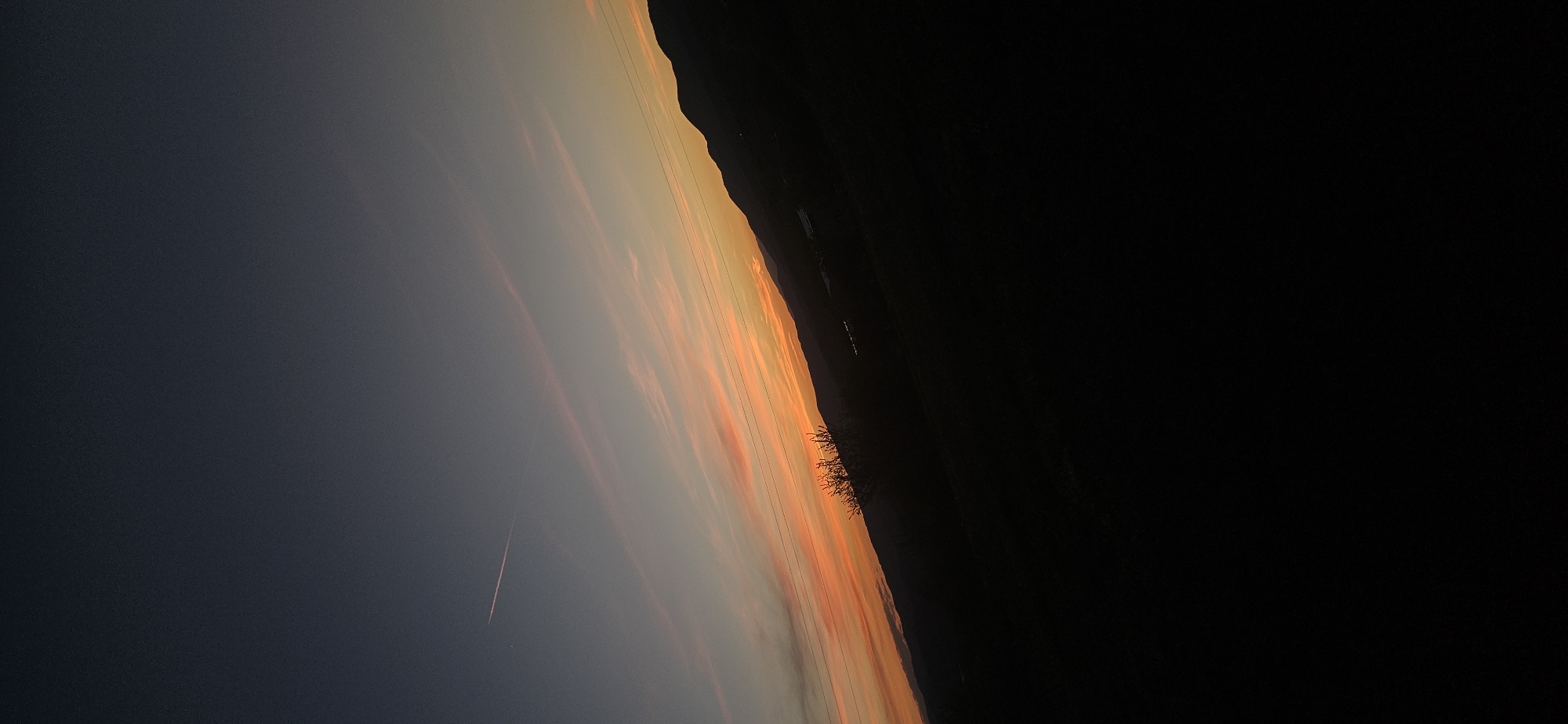 sunset in Momin Prohod, Bulgaria. The sky transitions from dark blue on the left to vibrant orange and pink hues near the horizon. A contrail from an aircraft is visible in the dark blue portion of the sky. The horizon line is partially obscured by a dark, silhouetted mountain range, and silhouetted trees or bushes are visible along the mountain's edge. The right side of the image is almost entirely black, suggesting either deep shadow or the night sky.