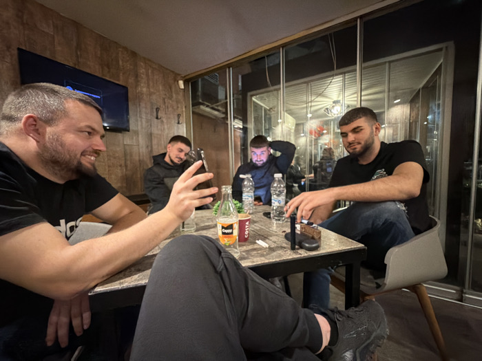 The image depicts an indoor scene within a cafe or bar located in Kyustendil, Bulgaria, featuring four adult males seated around a rectangular table with a light-colored, textured surface