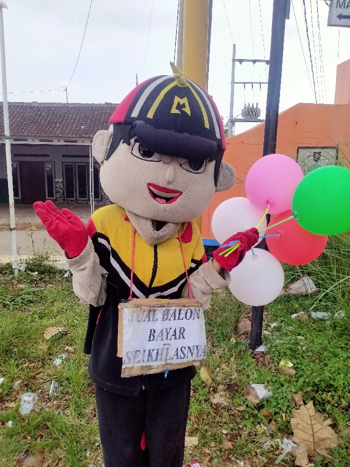 A person in a full-body mascot costume stands in a grassy area with scattered litter in Unknown, Unknown. The mascot features a light beige head with large black eyes, a red smiling mouth, and wears a black, red, and yellow baseball cap adorned with a yellow 'M' logo and a small green sprout-like detail. The costume includes a yellow jacket with prominent black and white diagonal stripes, red gloves, and dark-colored pants. The mascot's left gloved hand is raised, palm open, while its right gloved hand holds a cluster of five round balloons: one pink, one green, two white, and one red, each attached to a plastic stick. A makeshift sign, constructed from cardboard and white paper, hangs from the mascot's neck via a red string, displaying the Indonesian text "JUAL BALON BAYAR SEIKHLASNYA" (Sell Balloons Pay As You Wish). In the background, to the left, is a single-story residential building with a brown tiled roof. To the right, an orange-colored building is partially visible behind a dark utility pole fitted with a transformer and overhead electrical lines. The sky is uniformly overcast.