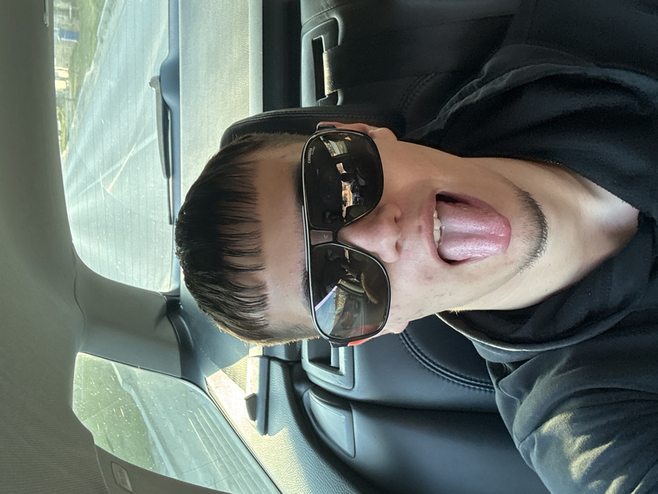 A young adult male is positioned in the rear passenger seat of a vehicle, captured in a selfie-style photograph