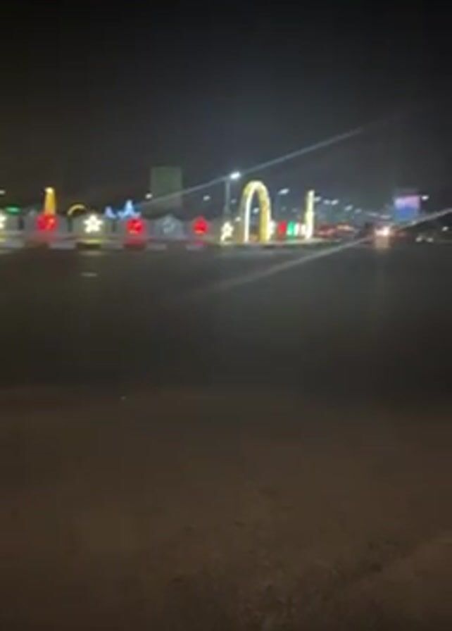 street at night illuminated with holiday decorations. A row of lighted decorations, including stars, arches, and a Christmas tree, lines the street. Car traffic can be seen in the distance. The camera is stationary, capturing the scene from a slightly low angle. The environment is dark, with the decorations serving as the main source of light.