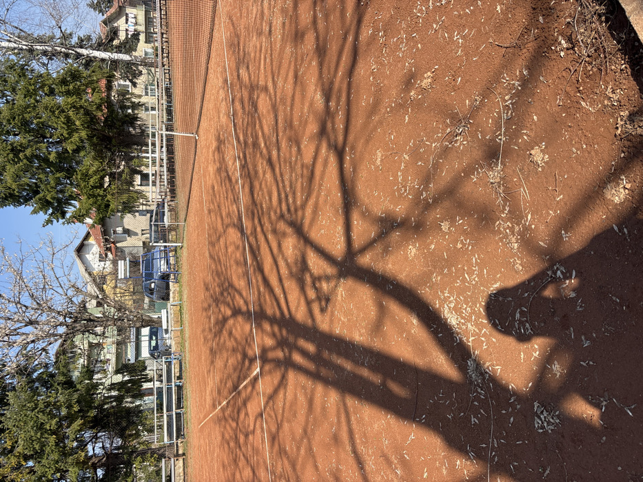 The image depicts a red clay tennis court located in Berkovitsa, Bulgaria, under direct sunlight. White boundary lines are present on the court surface. A dark-colored tennis net bisects the court horizontally in the mid-ground, supported by blue and white posts. Strong sunlight casts distinct, intricate shadows of a large, bare deciduous tree across the court's foreground and mid-section. Additionally, the shadow of a human figure holding a device, likely a camera or mobile phone, is visible in the lower-left foreground. The clay surface exhibits scattered debris, consistent with dried leaves or plant matter. In the background, beyond the far side of the court, a perimeter fence separates the playing area from a grassy strip containing multiple empty wooden benches. Behind these benches, several residential buildings of varying architectural styles are visible, interspersed with both evergreen conifer trees and bare deciduous trees. At least two dark-colored vehicles, possibly SUVs, are parked between the buildings and the court's perimeter. No individuals are actively present on the court or in the immediate background, aside from the inferred photographer.