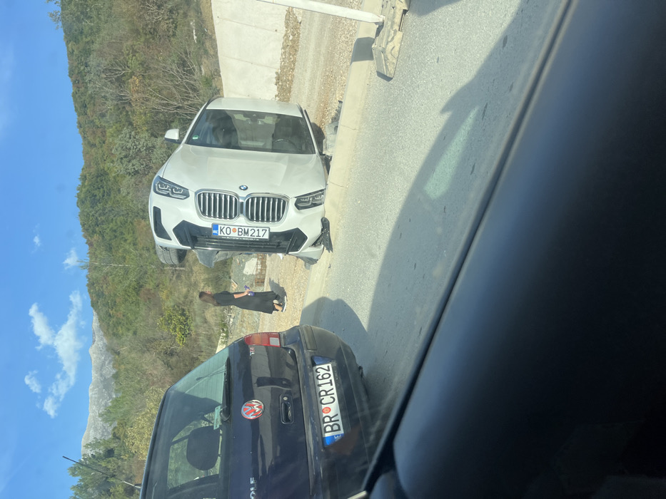 The scene depicts a vehicular accident on a paved road in Radanovići, Montenegro. A white BMW SUV, bearing Montenegro license plate KO BM217, is overturned and rests on its passenger side. The front grille and headlights of the SUV face the viewer, with its front wheels positioned against a concrete curb. A dark blue Volkswagen Golf, with Montenegro license plate BR CR162, is stationary behind the overturned SUV, facing the same direction. One female individual, dressed in a dark long-sleeved dress and light-colored sneakers, stands on the unpaved shoulder next to the overturned BMW, observing the scene. The background features forested hills and mountains under a clear blue sky with scattered clouds. A concrete retaining wall is visible behind the accident site, with metal rebar protruding from the ground nearby. The image is captured from inside another vehicle, with its dark dashboard and window frame visible in the lower foreground.