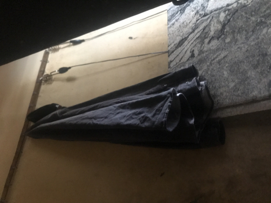 Within an interior space at Rukuba Road, Nigeria, a dark-colored garment, likely a shirt or jacket, hangs from a horizontal wooden rod fixed to a light tan or off-white wall