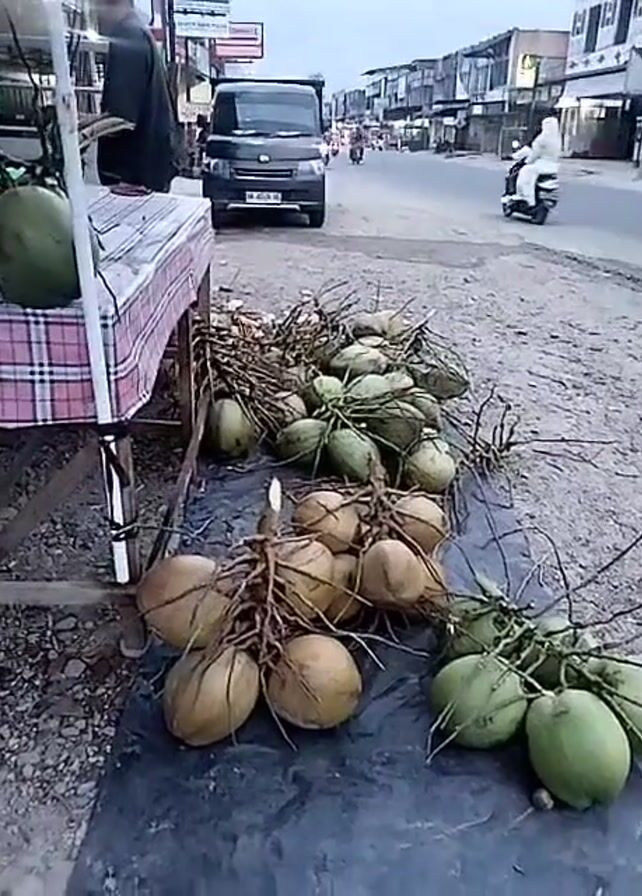 A street scene featuring a coconut vendor's stand. Numerous coconuts, some green and some brown, are displayed on the ground next to the stand, as well as a few on top of it. A man in a cap is seen standing behind the stand. Another person is visible in the act of retrieving something from the stand. A street with passing vehicles forms the backdrop.