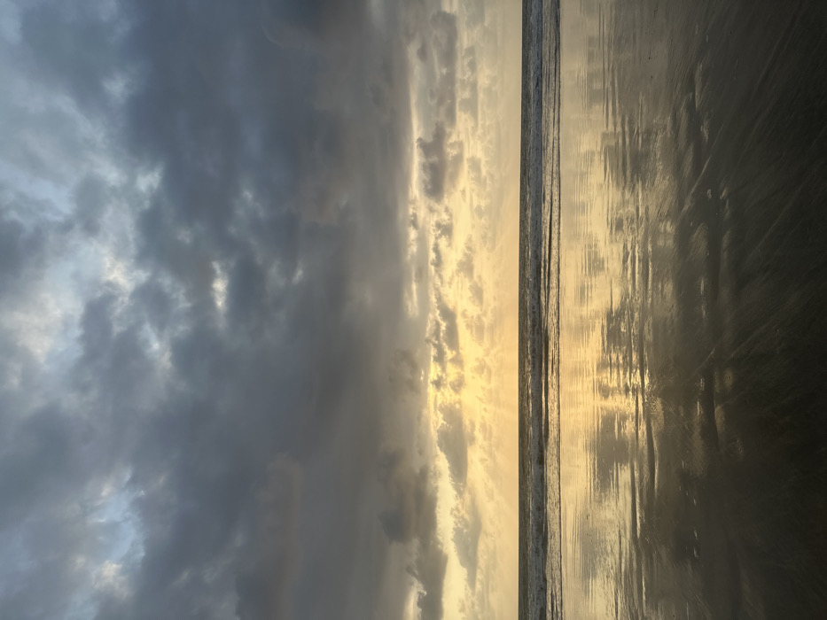 A dramatic beach scene is split into contrasting halves. The left side displays a cloudy, stormy sky, with gray and dark hues dominating. In the middle, sunlight streams through a break in the clouds. To the right, the wet sand of the beach reflects the golden sunlight and sky. The receding tide has left behind a dark, smooth surface, mirroring the sky's celestial display.