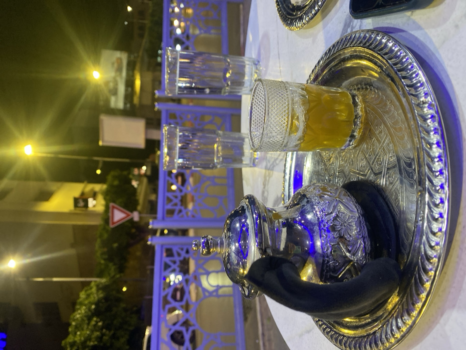 A silver tea set sits on a round, white table with intricate blue metalwork in the background. The set includes a teapot with a black handle cover, a tray with a tea glass filled with a golden liquid, and two empty clear glasses. Outside, streetlights illuminate the scene, casting light on nearby buildings and trees. A triangular yield sign is visible in the background.