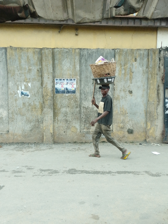 An outdoor scene in Agani, Nigeria, depicts a lone male figure walking from right to left across a light grey paved surface. The individual, of dark complexion, wears a black baseball cap, a dark t-shirt with a light rectangular graphic, and light brown trousers with noticeable staining. He is shod in sandals, one appearing green and the other yellow. On his head, he balances a black plastic tray, topped with a woven basket containing various items, including a purple plastic bag. He holds a long, thin, light-colored wooden stick vertically in his right hand. The background consists of a textured, light grey concrete or plastered wall, exhibiting weathering, dirt, and cracks. Two identical black and red posters, depicting multiple figures, are affixed to the wall's center, with other torn papers visible to the left. Above this wall, a light yellow-painted building section is visible, capped by a weathered, corrugated metal roof structure. To the far right, a dark metal gate or door is partially visible. The ground is a light grey road surface with darker patches. The scene is illuminated by natural, even light.