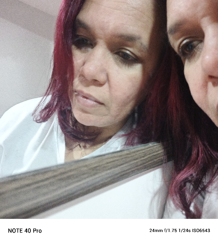 A woman with dyed red hair gazes into a mirror, her reflection partially visible on the right. She wears a white garment. The mirror's edge, a dark-toned wood, is prominently featured in the foreground. The setting appears to be indoors, with a plain wall visible in the background. The image metadata indicates it was taken with a NOTE 40 Pro at 24mm, f/1.75, 1/24s, and ISO6543.