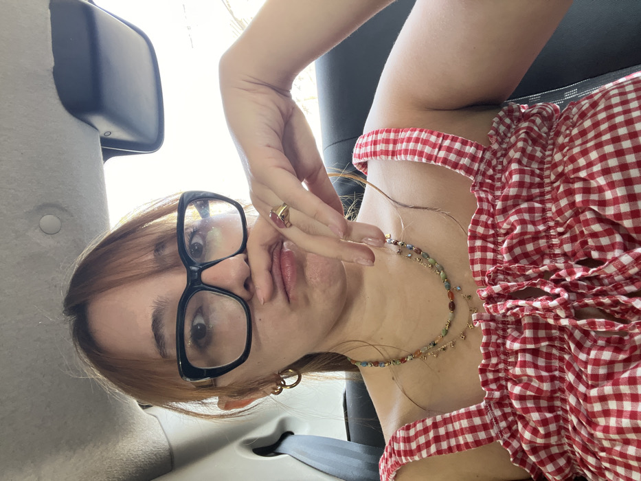 This image depicts a female individual seated within the interior of a vehicle, in Mexico City, Mexico. The subject, positioned centrally, has light brown hair with bangs, wears large black-framed glasses, and a red and white gingham-patterned top with ruffled straps and a cinched front. Her lips are pursed forward, and her left hand is raised, with the thumb touching her chin and fingers partially obscuring her lower face. She wears small gold hoop earrings and two beaded necklaces. A gold ring with a large reddish-pink stone is visible on the ring finger of her left hand. The vehicle's light-colored headliner and a dark sun visor are visible in the upper background. Natural light illuminates the scene, suggesting daylight conditions.