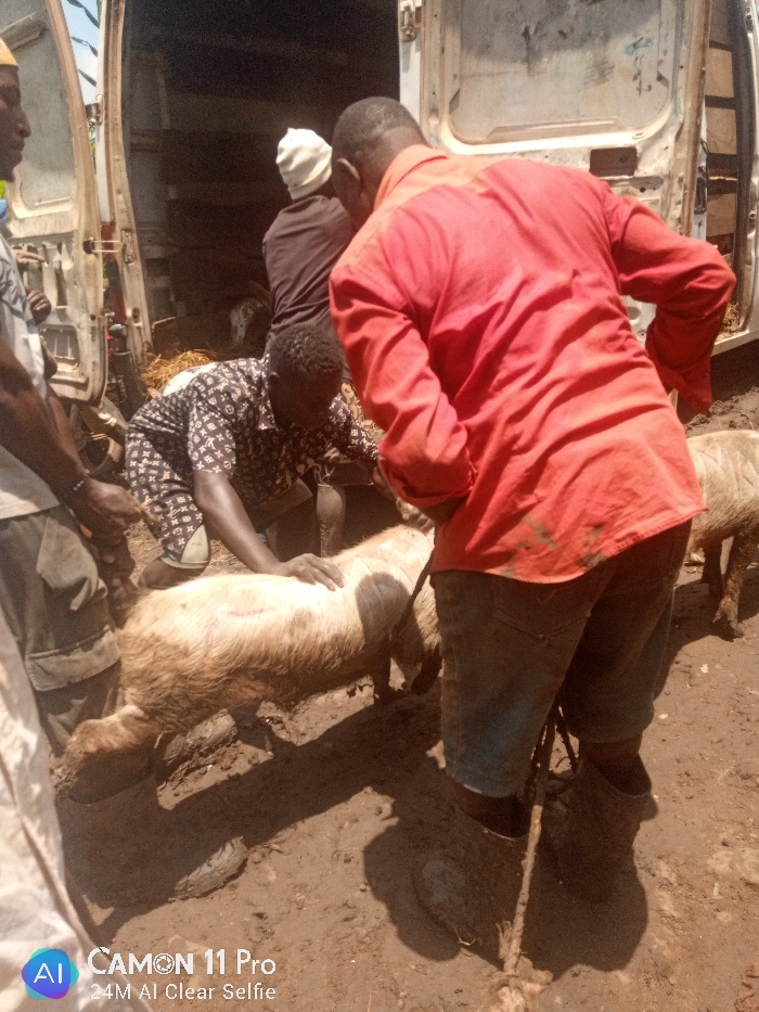 In Unguwan Rimi, Nigeria, a daylight scene depicts five individuals engaged in livestock handling on uneven, reddish-brown, muddy terrain