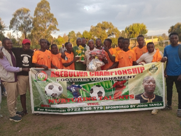 An outdoor photograph captured in Chevaywa ward, Kenya, shows approximately 18 individuals, primarily young adult males, posing behind a horizontal banner on a grassy field. The banner, central to the image, reads "ABEBUWA CHAMPIONSHIP FOOTBALL TOURNAMENT" and "NURTURING TALENTS," displaying images of footballs, football players, and a portrait of "JOHN YANGA," identified as the sponsor. On the far left, a male in a light-colored jacket and khaki shorts stands next to another male wearing a black t-shirt printed with "OPPOSITION LEADER" and a red cap. The majority of the group, consisting of about 14 males, are dressed in matching orange football jerseys and dark shorts. One male in a green shirt holds two gold-colored trophies. Another male in a light-colored top holds several white footballs and a red and white bundle. To the far right, a male wears a blue t-shirt, dark trousers, and carries a dark backpack. The background features numerous trees with light-colored trunks and sparse foliage, indicating an open field or park environment. Faint, light-colored structures are discernible in the distance on the right. The sky is overcast, producing soft, diffused lighting, suggesting late afternoon or early evening. The ground is covered with dry grass and dirt.