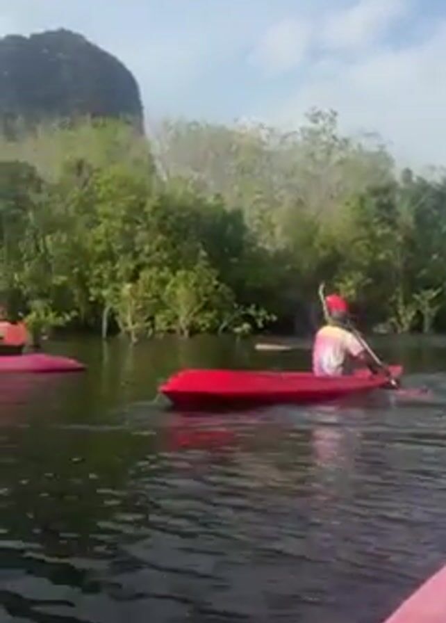 group of people kayaking on a river surrounded by trees and mountains. There are at least three kayaks visible in the video, one pink, one red, and one blue. The people in the kayaks are paddling and enjoying the scenery. The weather is sunny with some clouds in the sky. The environment appears calm and peaceful. In some shots, the sun shines brightly, creating a lens flare effect.