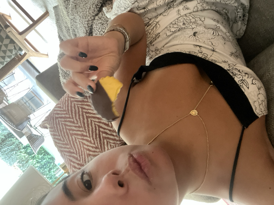 An individual is depicted indoors, reclining on a sofa, in Lordelo do Ouro e Massarelos, Portugal. The subject, a female, is visible from the chest up, positioned on the left side of the frame, gazing towards the camera with slightly pursed lips. She wears a black spaghetti strap top, a light-colored garment with a dark floral pattern, and a delicate gold-colored necklace with small circular pendants. Her right hand, featuring dark nail polish and multiple metallic bracelets on the wrist, holds a partially consumed, yellow-colored confection with a dark chocolate coating. Behind the individual, a reddish-brown and white chevron-patterned cushion and a grey textured throw blanket are visible. The background reveals a brightly lit outdoor area through a large window, featuring lush green foliage, outdoor wicker chairs, and a table, consistent with a patio or garden setting.