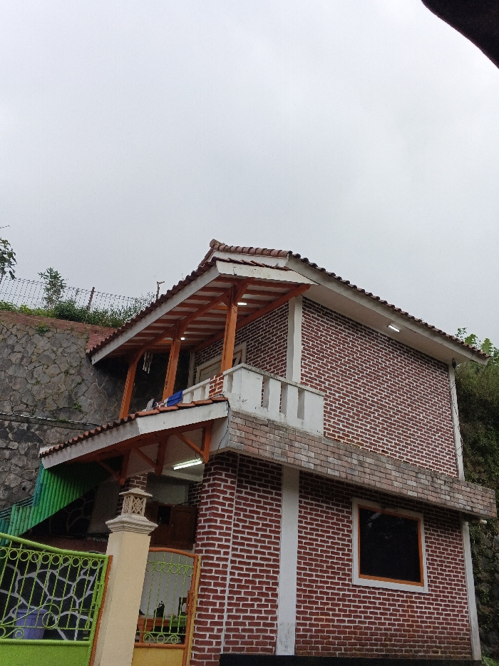 A two-story brick building under a cloudy sky stands on a hillside. The structure has a red tiled roof with white trim and exposed wooden rafters. A small balcony is present on the second story. A green fence and gate are visible in the foreground. The surrounding area features stone retaining walls and greenery. A window is visible on the side of the building, which is painted black.