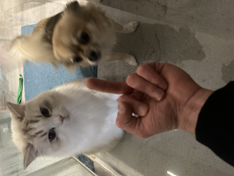 The scene, located in Erstein, France, depicts an adult human left hand performing an obscene gesture with an extended middle finger, directed towards two domestic animals. In the midground, a seated bicolored cat, predominantly white with light brown markings on its head and ears, looks directly at the gesturing hand. To the right of the cat, a tan, long-haired dog, resembling a Chihuahua, stands on a light-colored tiled floor, gazing slightly past the hand. The floor exhibits areas of dampness or liquid. In the background, behind the animals, a clear partition is visible, with a blue mat and a small green fabric item positioned behind it.