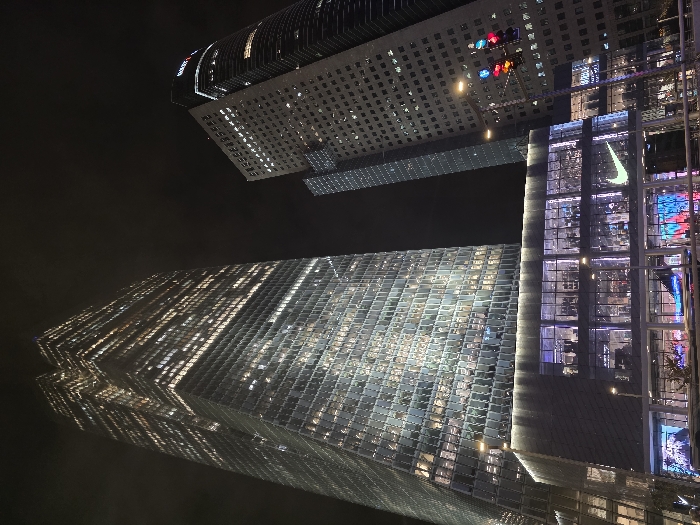 Two illuminated skyscrapers pierce the night sky. One, clad in a reflective grid pattern, seems to mirror its own reflection, possibly due to a nearby body of water. The second skyscraper is partially visible, featuring a distinct Nike logo prominently displayed. A colorful street scene with traffic signals adds a vibrant touch to the urban landscape.