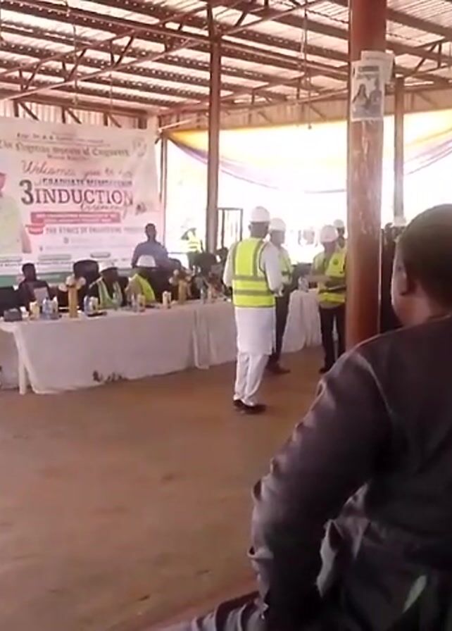 The video depicts an indoor event under a large metal structure with a banner announcing "The Nigerian Society of Engineers 3rd Induction Ceremony