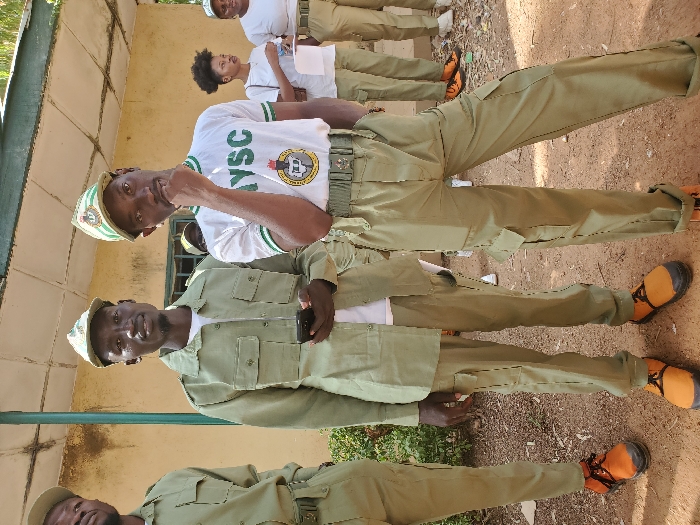 The image displays an outdoor gathering of several young adults, predominantly males, all dressed in attire associated with the National Youth Service Corps (NYSC) program in Jos, Nigeria
