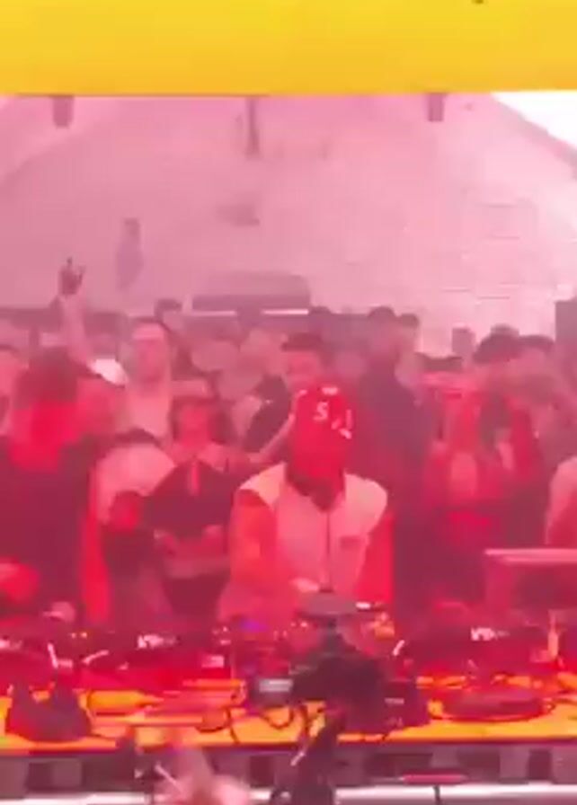 DJ performing at a club. They are wearing a white shirt, glasses and headphones and standing behind a console with a lot of equipment and cords. Several people are standing behind the DJ. The lighting is red and there is a large screen above the DJ, also lit up red. The overall setting appears to be a dark club with a lively atmosphere.