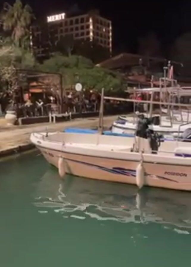 nighttime marina scene. Several small white boats are docked in the water, gently rocking. The closest boat is labeled "POSEIDON 510," and a black outboard motor is attached to its back. In the background, there are lights illuminating a restaurant or outdoor bar area with people seated at tables. Further back, a tall building with "MERIT" displayed on top is visible. The water is a greenish hue, reflecting the lights. The atmosphere seems calm and quiet.