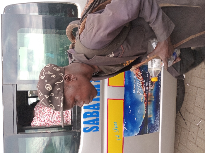 This image depicts an individual standing next to a passenger vehicle in the City of London ward, Kenya. The subject is an adult male, shown in right profile, wearing a dark brown cap with light circular and wavy patterns, a dark grey or brown long-sleeved jacket, and dark trousers. A large, coiled bundle of brown material, resembling rope or hose, is carried on his back, secured by straps. In his right hand, he holds two clear plastic bottles, one appearing partially full, and a slender light-brown wooden stick or tool. The individual is positioned alongside the left side of a silver-colored minibus or matatu. The vehicle's side features the partial word "SABAL..." in large blue capital letters. Below the windows, a yellow rectangular strip displays "14 Pass" in dark script. Further down, a prominent sticker shows a serene landscape with a lake and mountains, overlaid with the religious text: "Whatever you ask in prayer believe that you have received it, and it will be yours. Mark 11:24". Through a partially open window in the upper left of the vehicle, a person wearing a white and red patterned fabric is visible inside. The ground beneath the subject is a paved surface, consisting of interlocking blocks, with some scattered small debris. The scene is illuminated by natural daylight.