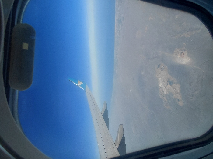 The view from an airplane window shows a bright blue sky above and a dusty, desert-like landscape below