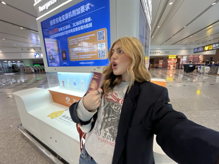 A female individual is depicted taking a selfie inside Beijing Daxing International Airport in Langfang, China