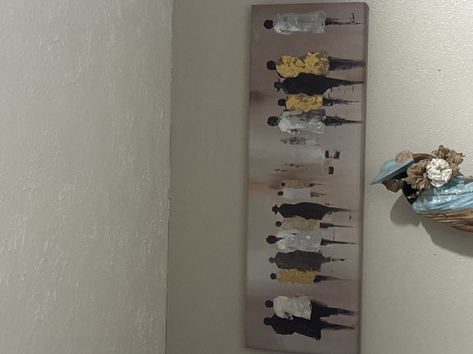 The image displays an indoor scene in Oklahoma City, United States, featuring a wall adorned with artwork and a figurine. The upper portion of the frame shows a light-colored, textured popcorn ceiling meeting a light beige, smooth wall. Centrally positioned on the wall is a large, rectangular, horizontally oriented abstract painting. This painting depicts numerous stylized human figures, appearing elongated and in motion, rendered with minimal detail against a muted beige and light brown background. The figures are clothed in varying colors, including black, white, light gray, yellow, and light brown; some wear hats. The artist's signature, "Cool," is visible in the bottom right corner of the canvas. Partially visible in the lower-center foreground is a decorative figurine depicting an African American woman from the bust up. She wears a light blue broad-brimmed hat, a light blue top with a textured surface, and a necklace, accessorized with light-colored, possibly fabric, floral embellishments near her right shoulder.