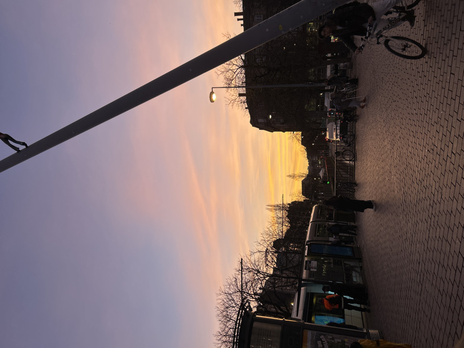 A street scene under a vibrant sunset, capturing urban life. A tram station is visible, with passengers boarding. A cyclist and pedestrians move along a brick-paved sidewalk. Silhouetted buildings and bare trees line the street, with a street lamp casting a soft glow. A striking metallic structure dominates the upper left of the frame, with someone walking on it. The warm hues of the sky contrast against the dark silhouettes, creating a vivid and atmospheric image.