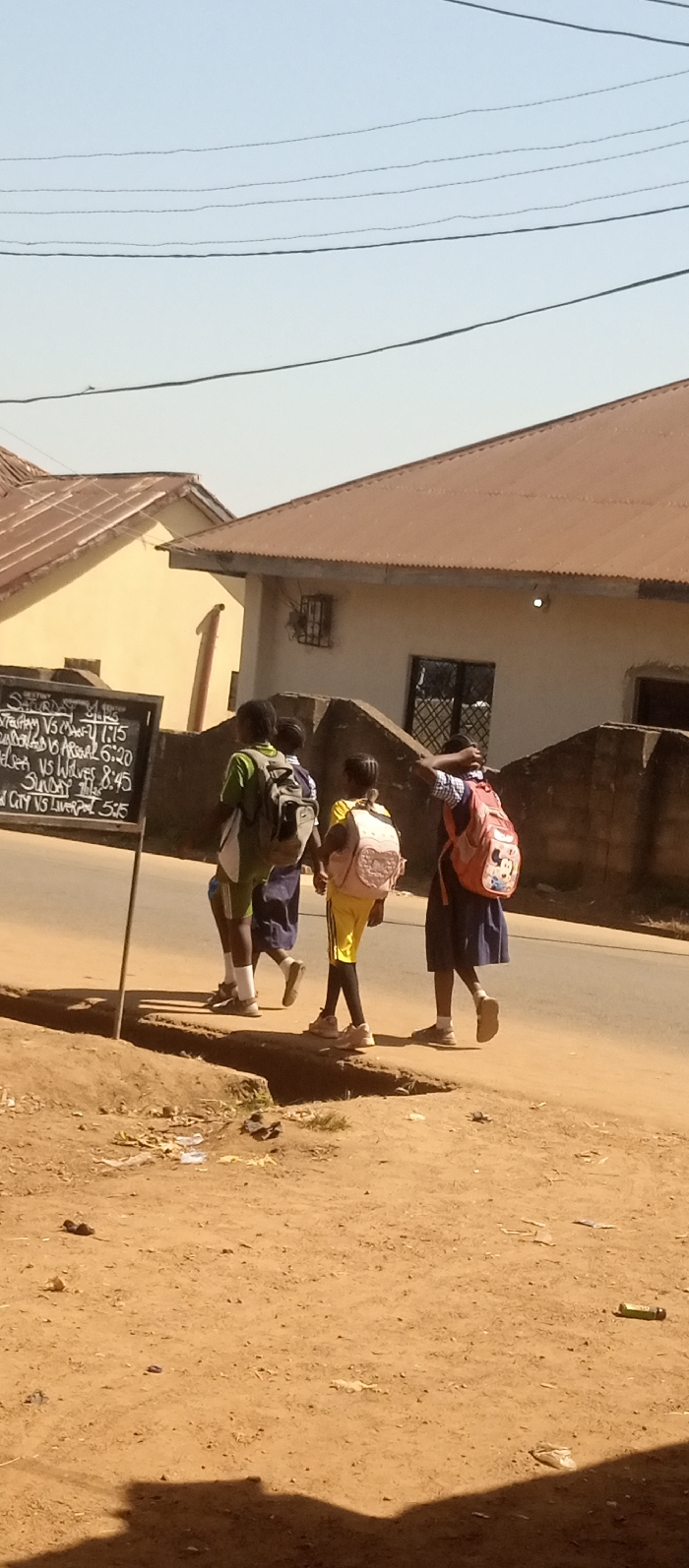 The image captures a sunlit street scene in Akwanga, Nigeria. Three individuals, likely students, are depicted walking away from the camera on a paved road. The person on the left wears a green top, dark shorts, and a light-colored backpack. The middle individual wears a yellow top, yellow shorts with dark side stripes, and a pink backpack with a design. The person on the right wears a dark uniform dress, a light shirt, and a red backpack featuring a Mickey Mouse motif, with their right hand touching the back of their head. To the immediate left of the frame, a black chalkboard sign stands on the dirt shoulder, displaying handwritten text that includes sports schedules, such as "TOTTENHAM VS CHELSEA 1:15" and "MAN CITY VS LIVERPOOL 5:15." The paved road is bordered by a reddish-brown dirt shoulder, which shows minor debris and a shallow drainage channel. In the background, multiple buildings are visible; one is light yellow with a corrugated brown roof, and another is cream-colored with a similar roof, barred windows, and a low, block-like perimeter wall. Overhead, several utility wires span across a clear, pale blue sky. Shadows are cast by the individuals and the sign, indicating direct sunlight.