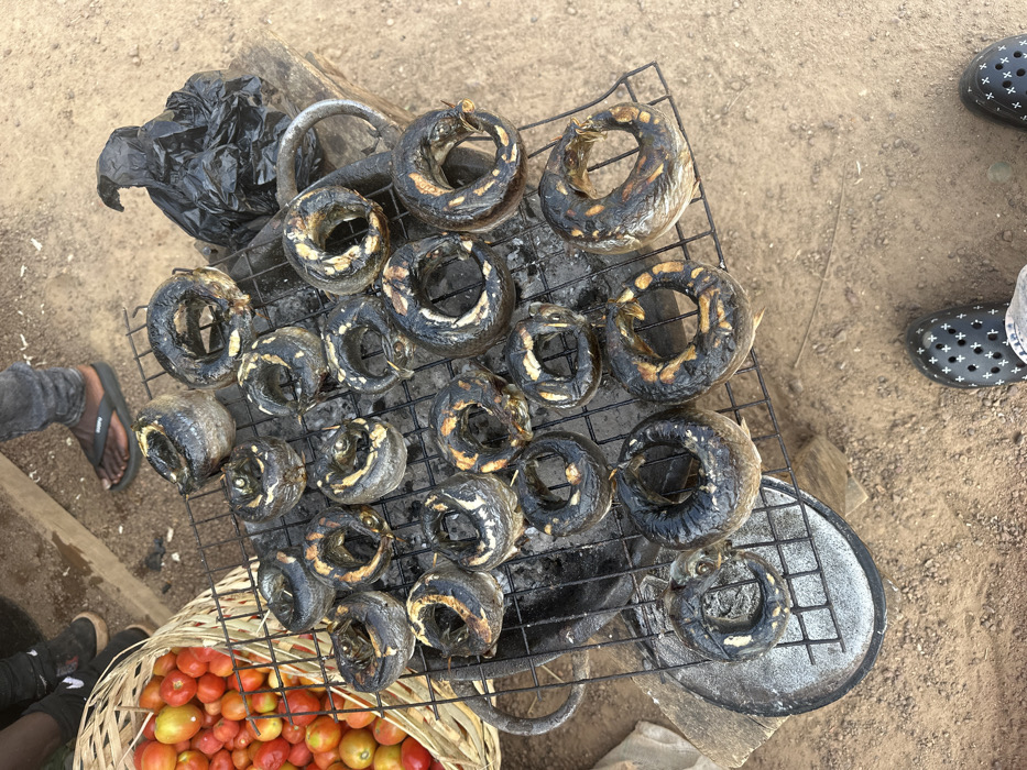 An outdoor market scene in Durimi, Nigeria, is depicted from a high-angle perspective. The central focus is a metal grate holding approximately 23-25 smoked or dried fish, each curled into a distinct ring shape. These fish exhibit dark brown to blackened skin with areas of lighter golden-brown discoloration, indicative of the smoking process. To the left of the grill, a large, woven bamboo basket overflows with numerous ripe red and yellow tomatoes. Beneath the grill, a dark, possibly cast-iron cooking vessel is partially visible on the ground, suggesting a cooking or heating apparatus. To the right of the grill, a crumpled black plastic bag rests on a small, dark wooden block or stool. In the upper left portion of the image, the lower legs and feet of a person wearing black sneakers and dark trousers are visible. In the upper right, the lower legs and feet of another person wearing black flip-flops and dark trousers are present. In the lower foreground, the feet of a person wearing black Crocs-style clogs with white embellishments and light-colored jeans are visible. The ground throughout the scene is composed of light brown, dry earth or sand.