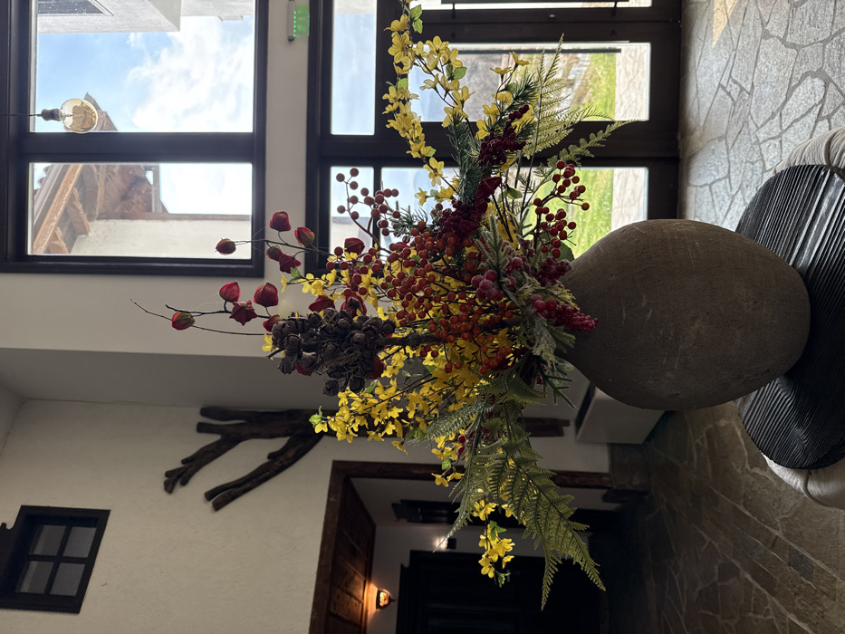 The image displays an interior scene in Krasnovo, Bulgaria, centered on a large, ovoid, dark grey stone-like vase containing an artificial floral arrangement
