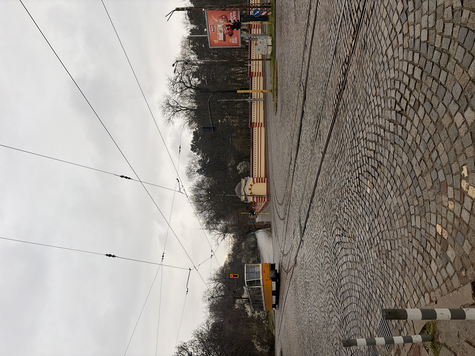 street scene in Sofia, Bulgaria, on a cloudy day. The street is paved with cobblestones and features tram tracks. A yellow and white tram is present on the tracks, stopped at a traffic light that is red. Overhead tram wires crisscross the sky. To the right of the tram, there is a wall with cream and dark red stripes. Behind the wall are bare trees. Further along the street, a billboard is visible, along with other street furniture, including a traffic light with a red light visible. To the lower right, there are two black and white striped poles at the edge of the street.