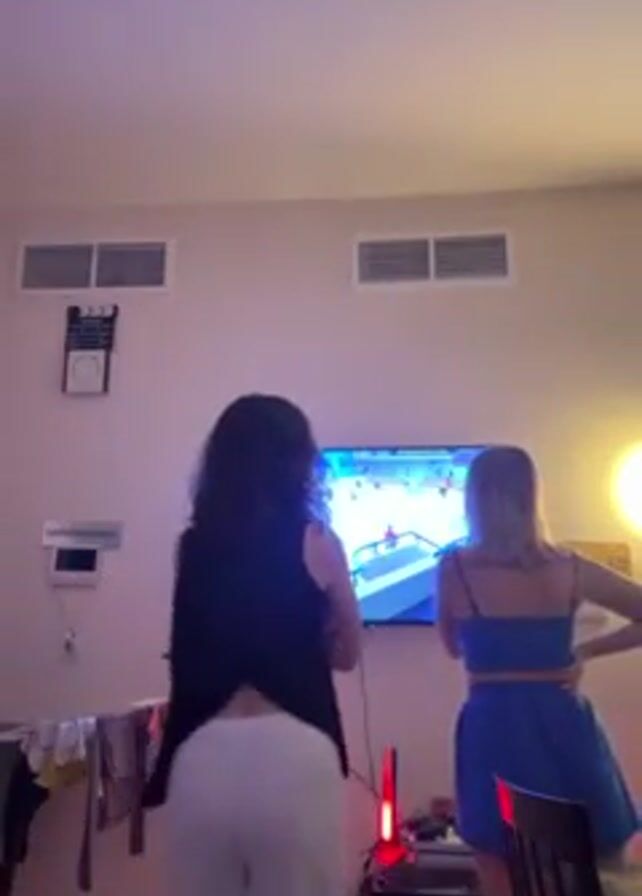 Two women stand in a room, facing a television. The woman on the left is wearing a black tank top and white pants. The woman on the right is wearing a blue two-piece outfit. The television is displaying a video game with a red character on a blue track. The room also contains an air conditioner, a speaker, some lights, and a chair. There are clothes hanging on a line in the background. The light in the room appears to be purplish.