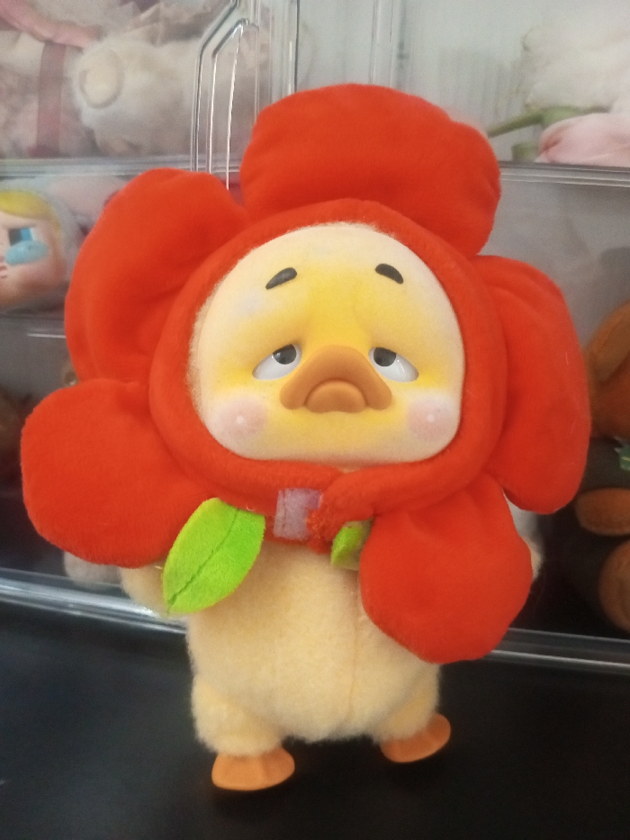 A plush toy resembling a duckling in a red flower costume stands prominently. The duckling has yellow plush skin with sad eyes and a beige beak. A red, plush flower surrounds its face like a hood, with additional petals and green leaves accenting the costume. The duckling's body is also yellow plush, and it has small, orange feet. The background features a display case with other plush toys.