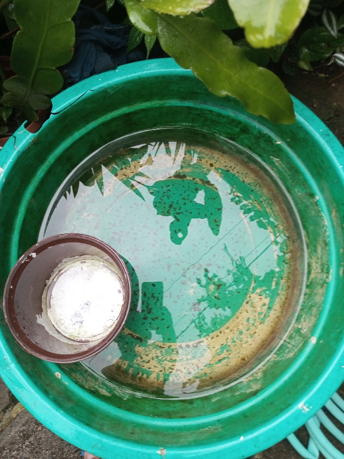 A green plastic basin, partially filled with water, sits outdoors. A smaller brown pot containing a white substance floats within. The water reflects foliage above, creating distorted patterns on the basin's bottom. The basin shows signs of wear with visible cracks and worn paint. Green plant leaves are visible in the upper portion of the image. A blue hose is seen in the lower right corner.