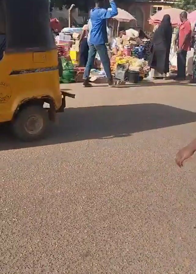 bustling street scene with several three-wheeled vehicles, commonly known as auto rickshaws or tuk-tuks, parked or driving by. The vehicles are painted in bright colors, primarily yellow and green. A crowd of people are gathered near a display of goods, including packaged food items and other merchandise, suggesting a market or commercial area. One man carries a stack of goods on his head. The road surface is asphalt. The weather appears sunny and bright, casting shadows on the ground. Several people are wearing traditional African clothing. There's a lot of activity and movement with people walking around and vehicles passing by.
