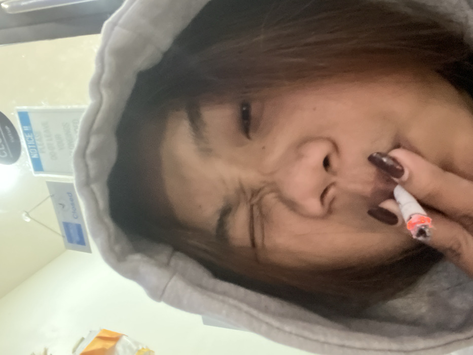 A close-up, low-angle image features an individual, likely female and of East or Southeast Asian descent, wearing a grey hooded sweatshirt with the hood up