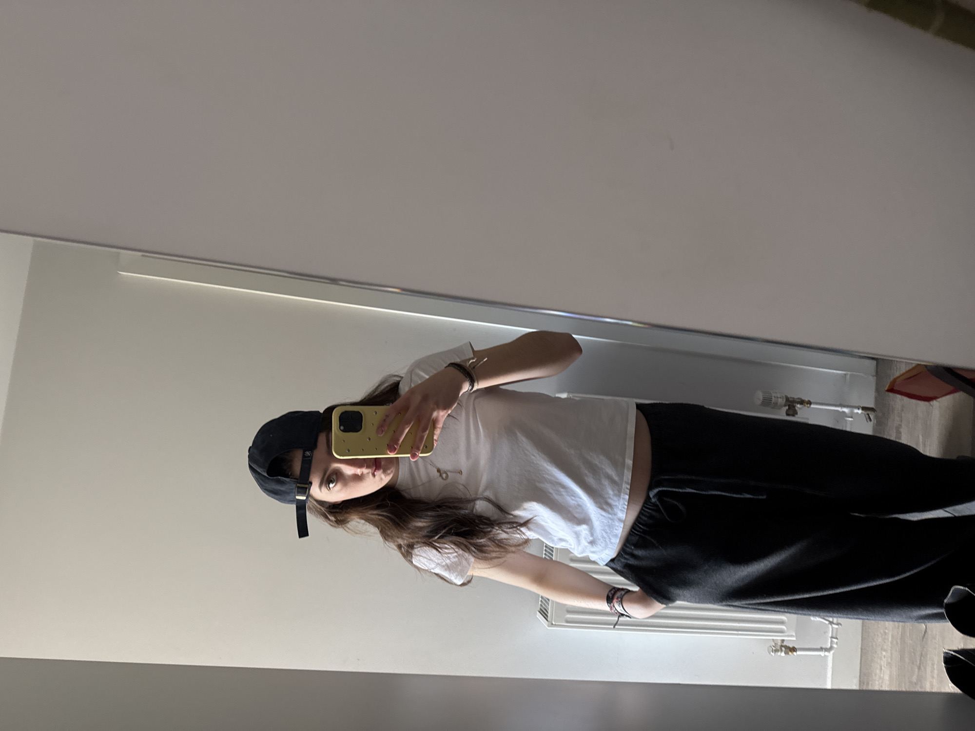 A young individual is depicted in a full-length mirror selfie taken indoors in Hull, United Kingdom. The person stands facing forward, wearing a dark blue baseball cap backward, a white cropped short-sleeved t-shirt revealing a portion of the abdomen, and dark gray loose-fitting sweatpants with a visible drawstring. A yellow smartphone is held in the left hand, pointed towards the mirror to capture the image, partially obscuring the lower face. The right hand is partially inserted into the right pocket of the sweatpants. A silver-colored chain necklace with a key-shaped pendant is visible, along with multiple bracelets on both wrists. The person's gaze is directed towards the camera with a slight pout. The background, reflected in the mirror, consists of a light-colored wall, a white panel radiator with associated piping, and light-colored wooden floorboards. Two dark objects, possibly shoes, are on the floor in the bottom left corner of the reflection, and a partial red object is visible on the floor in the bottom right.