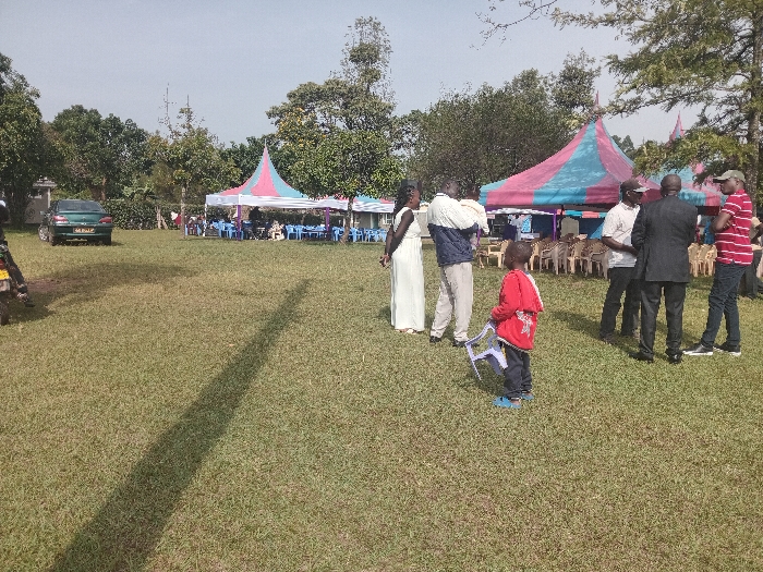 An outdoor gathering features several people on a grassy lawn. Two tents with pink and blue coverings stand in the background, one to the left and one more prominent on the right, each with chairs arranged underneath. A woman in a white dress, a man holding a baby, and a child with a small blue chair stand nearby. A group of men in jackets and casual attire is also present. A green car is parked on the edge of the lawn. Trees surround the perimeter, creating a backdrop to the event.