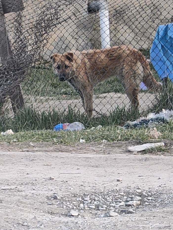 In the city of Omurtag, Bulgaria, a medium-sized dog with reddish-brown and black-striped fur stands behind a chain-link fence