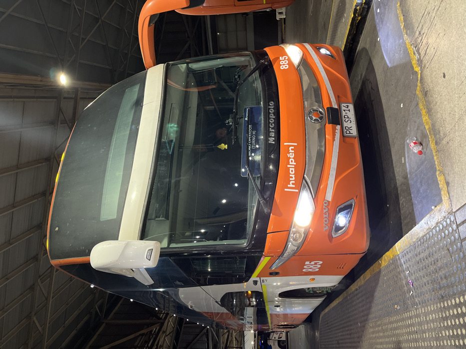 A large, orange, black, and white double-decker Marcopolo bus, bearing the number "885" and "Volvo" branding, is stationary in what appears to be an indoor bus terminal or maintenance bay in Santiago, Chile. Its headlights are illuminated. The bus prominently displays "hualpén" as a destination or route. A Chilean license plate, "PR SP-14," is affixed to the front bumper. Inside the driver's compartment, a person (likely the driver) is visible, and a yellow "Little Tree" air freshener hangs from the rearview mirror area. A sign on the dashboard reads "MUNI OPERADOR (TURNO H)." The floor is paved, with a raised concrete platform edged in yellow paint visible to the left foreground. A discarded clear plastic bottle and some small debris are on the ground near the front of the bus. Overhead, exposed metal girders and bright industrial lighting are visible. Part of another orange bus is visible on the far right, and a white vehicle is partially seen in the background to the left.