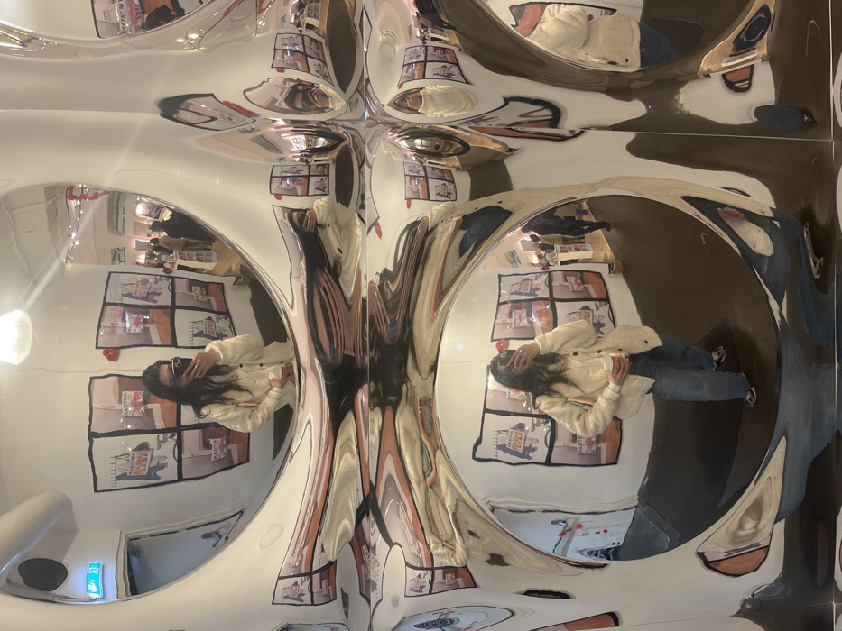 An individual is captured taking a selfie within a highly polished, silver-chrome distorting mirror, which forms the dominant feature of the scene. The mirror's undulating, sculptural surface creates multiple warped reflections of the subject and the surrounding environment. **Location:** This scene is set within a contemporary art gallery or a high-end concept store in London, United Kingdom. The specific aesthetic of white walls, curated art posters, modern lighting, and interactive installations is consistent with venues found in central London districts known for art and design, such as Mayfair or Soho. **People:** One person, appearing female with long dark hair, is prominently featured through various reflections. She is dressed in a cream-colored collared jacket, light blue jeans, and white sneakers. She holds a smartphone with a dark case in her right hand, angled to photograph her reflection, and a white disposable cup in her left hand. In the background's distorted reflections, several other blurred figures are discernible, suggesting additional visitors or shoppers within the establishment. **Objects:** The central object is the large, artistic, and highly reflective chrome mirror. Reflected in its surface are: * Several framed posters or artworks on the white walls, consistently displaying the text "MAITRA," with some additionally showing "ARTIST" or what appears to be "HAZAR" or "BAZAR." These posters feature graphic or illustrative content. * A green emergency exit sign mounted above a doorway in the upper-left reflection. * Overhead lighting fixtures, including a prominent bell-shaped white lamp. * Display stands or counters further within the establishment in the blurred background. * The subject's smartphone and the white cup she is holding. **Actions:** The primary action depicted is the individual taking a selfie by photographing her own reflection in the distorting mirror. The other indistinct figures in the background appear to be moving or browsing. **Environment:** The setting is an indoor, well-lit modern space characterized by minimalist white walls and a dark floor. The overall ambiance suggests either an art exhibition space or a unique retail environment designed to incorporate artistic installations. The distorting mirror functions as both a functional object and an interactive art piece, creating a disorienting visual effect.