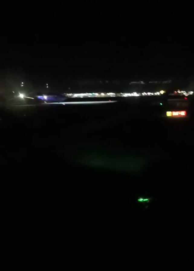 From an interior, seated perspective at night, blurred lights of an airport tarmac and structure are visible in the distance through a window. A wing of the plane in which the person is seated passes in front of the window at the beginning of the video.