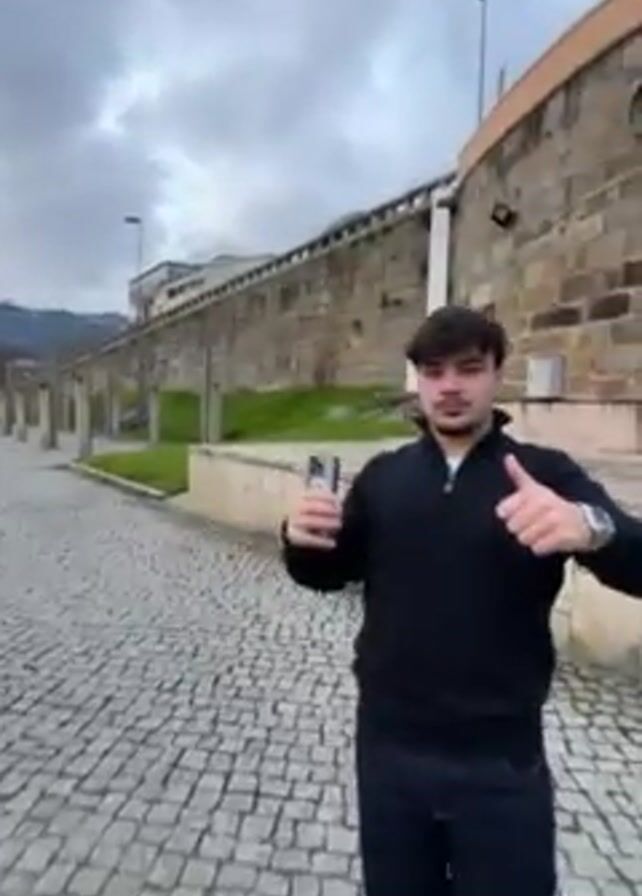 A young man with dark hair and a mustache gives two thumbs up while standing on a cobblestone path. He wears a black Lacoste sweater and black jeans. Behind him is a long, high stone wall with green vegetation growing on top. In the background, there are concrete pillars lining the path, leading to a distant cityscape under a cloudy sky. The cobblestone path extends into the distance. He is holding a cell phone. The camera then pans to follow the path.