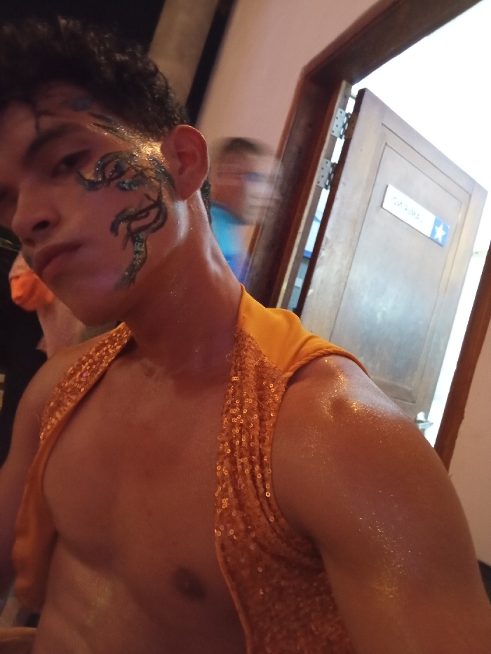 A shirtless man is captured in a medium shot. He wears a golden, sequined vest and has shimmering, artistic face paint on his left cheek. His gaze is directed downward, and his expression is serious. The background features a blurred figure and a partially open wooden door with a sign labeled "CVM JIMA" and a blue star emblem. The overall lighting is warm, highlighting the glitter and sequins on his skin and clothing.