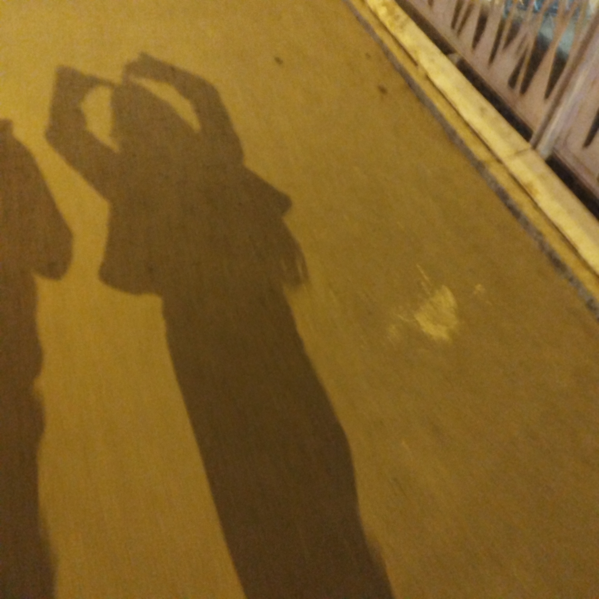The image depicts shadows cast on a paved surface, likely a sidewalk or walkway. One shadow resembles a person with their hands raised, forming a heart shape. Another shadow appears to be of another person, partially visible on the left. The background shows a blurred structure, potentially a fence or railing. The scene is illuminated by artificial lighting, giving the pavement a yellowish-brown hue. Without additional context, pinpointing the exact location in Yekaterinburg is not possible.